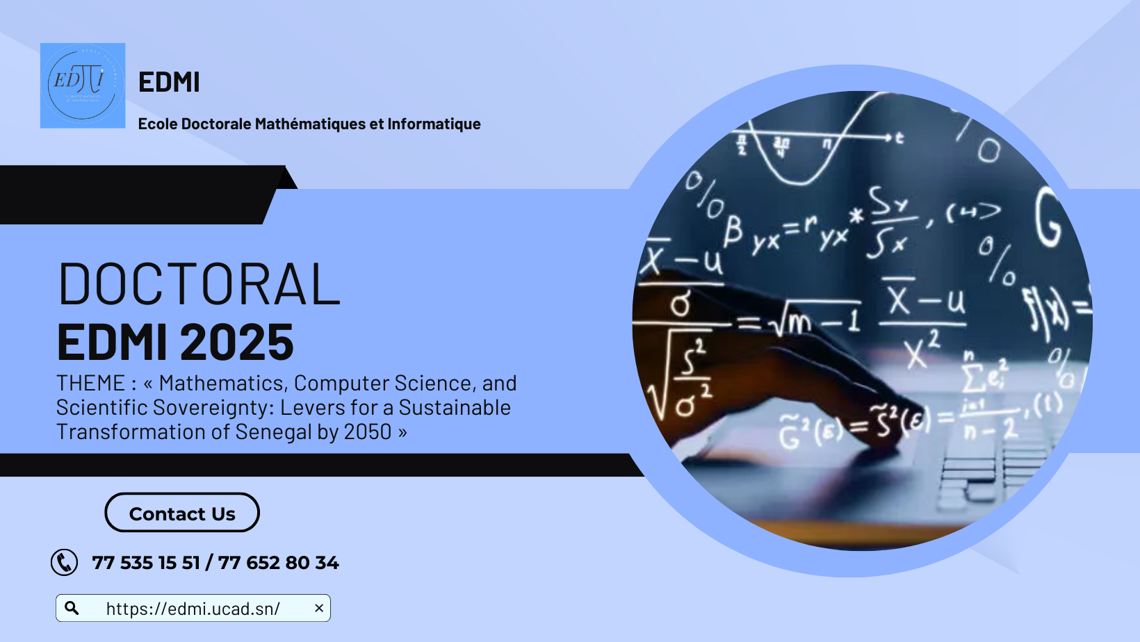 The Doctoral School of Mathematics and Computer Science (EDMI) is part of Cheikh Anta Diop University (UCAD) of Dakar. Its mission is to train and make former doctors better grounded in Mathematics, Computer Science and related fields.